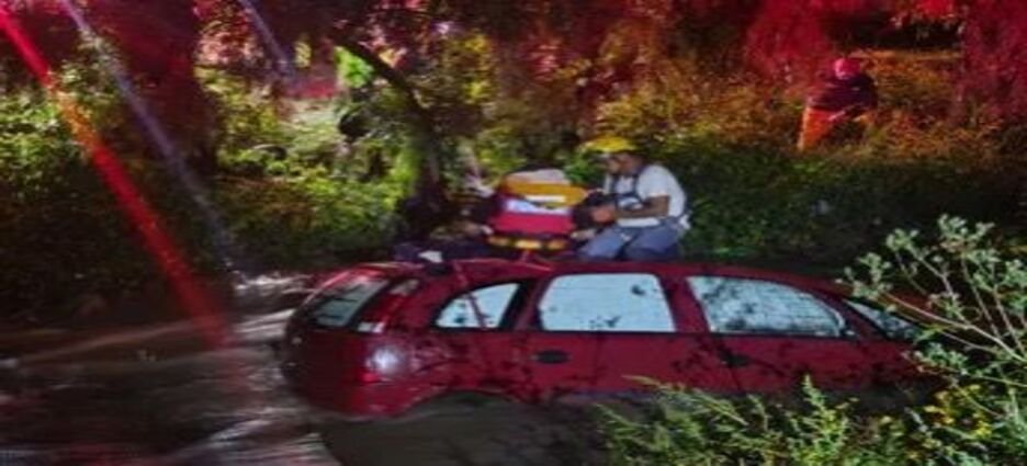 Rescatan a conductor atrapado en su auto tras ser arrastrado por corriente de río en Mineral de la Reforma